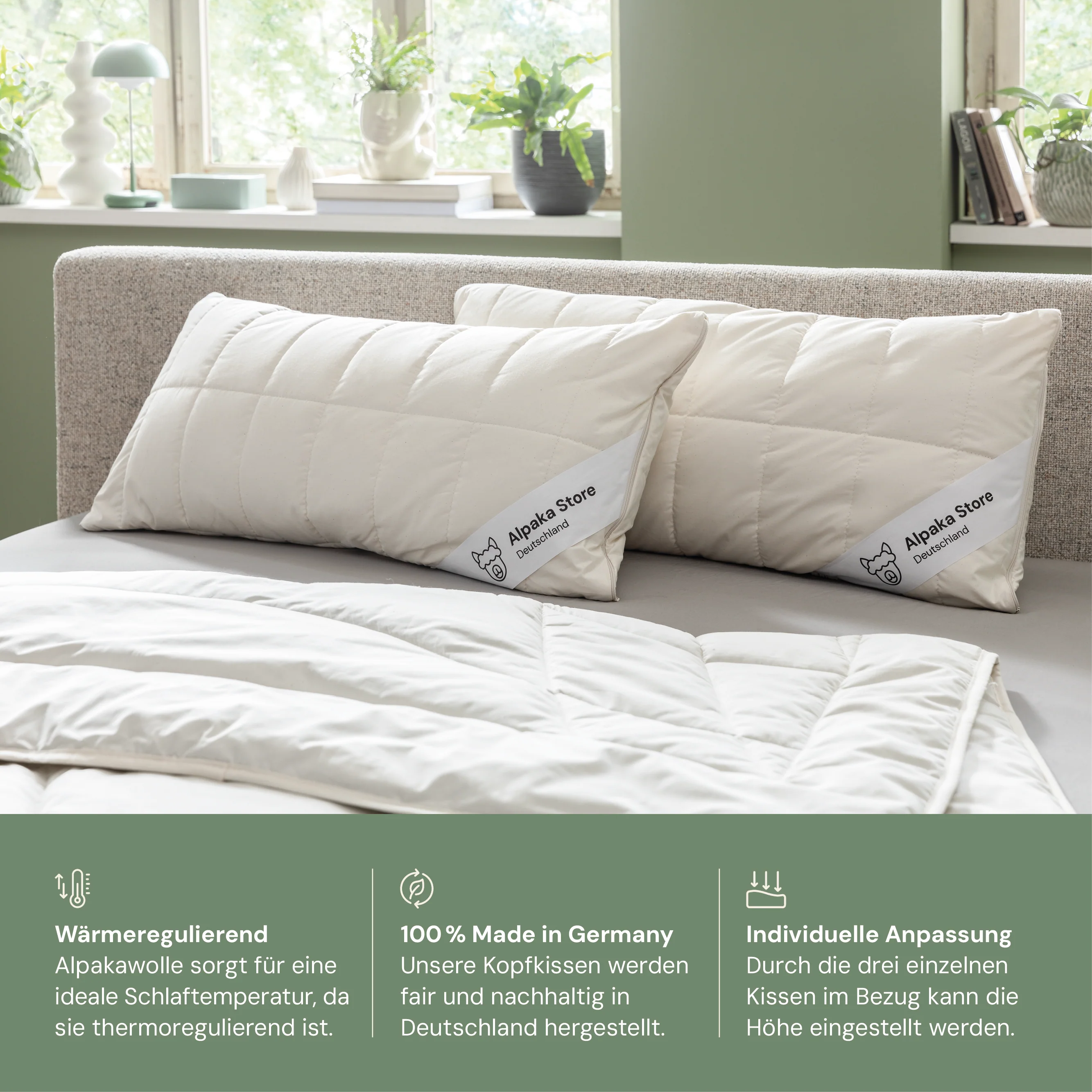 Das Stützkissen besteht aus drei Innenkissen, die jeweils mit 100% Alpakawolle gefüllt sind. Die Kissen können einzeln entnommen werden und bieten so eine flexibel einstellbare Höhe.